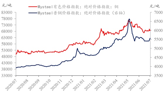 具體來(lái)看,6月鋼材消費(fèi)需求受高溫、雨季、汽車“缺芯”以及部分地區(qū)疫情反復(fù)等因素影響,五大品種表觀消費(fèi)量環(huán)比下降5.8%,但產(chǎn)量仍小幅增加,庫(kù)存連續(xù)三周累庫(kù),總庫(kù)存環(huán)比增加76萬(wàn)噸,鋼材基本面開(kāi)始走弱,疊加國(guó)家相關(guān)部門監(jiān)管加嚴(yán),鋼價(jià)承壓下行;著眼有色金屬來(lái)看,銅價(jià)大幅下跌后,下游采購(gòu)積極性有所提升,電解銅樣本庫(kù)存開(kāi)始快速去化,但由于宏觀情緒轉(zhuǎn)淡,美指快速上行,在預(yù)期面以及匯率市場(chǎng)上對(duì)電解銅價(jià)格形成打壓,疊加銅礦供應(yīng)增加,電解銅成本支撐走弱,導(dǎo)致6月銅價(jià)震蕩下跌。