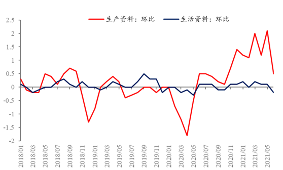 從PPI指數(shù)的構(gòu)成結(jié)構(gòu)來(lái)看,6月生產(chǎn)資料價(jià)格環(huán)比迅速下降,終端成本壓力將有所緩解,生活資料價(jià)格由于前期漲幅較低,故6月跌幅也較小。值得注意的是,PPI指數(shù)中生產(chǎn)價(jià)格指數(shù)的權(quán)重月74%,生活價(jià)格指數(shù)的權(quán)重僅24%,是6月PPI價(jià)格環(huán)比增速快速下行的主要原因。