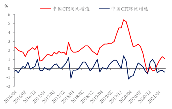6月CPI指數(shù)同比增速錄得1.1%,環(huán)比增速錄得-0.4%,CPI指數(shù)繼續(xù)溫和下滑。6月CPI指數(shù)持續(xù)下降的主要原因仍在豬肉價(jià)格的大幅下跌,跌幅一度高達(dá)13.6%,疊加鮮果、蔬菜大量上市,食品價(jià)格指數(shù)承壓下跌;而從非食品價(jià)格指數(shù)來(lái)看,雖然原油價(jià)格上漲提高了出行成本,但6月乃是傳統(tǒng)的旅游淡季,疊加部分地區(qū)疫情反復(fù),非食品價(jià)格由上月上漲0.2%轉(zhuǎn)為持平。
